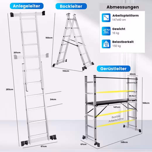 • Versatile use: stepladder (height 277 cm), step ladder (height 145 cm) or scaffold with work platform (height 165 cm)