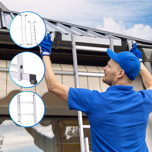 Important details such as the durable plastic coating of the work platform and the ladder/extension ladder with six rungs each featuring an anti-slip profile demonstrate the professional design principles. A handrail on the ladder enhances safety. For ease of assembly, the four vertically arranged metal stiles are equipped with easy-to-use locking mechanisms for height adjustment. Thanks to its high-quality aluminum construction, this multi-functional scaffold is easy to transport. After use, the scaffold folds up for space-saving storage.
