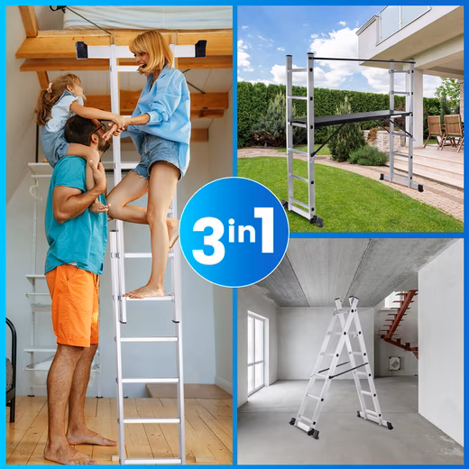 If you need a freely movable and customizable scaffold with a work platform, this multifunctional scaffold with wheels and ladder/extension ladder is an excellent choice. The combination of standardized scaffold components, such as the high-quality aluminum ladder, and a sturdy work platform makes this multifunctional scaffold an indispensable construction tool. Thanks to its stability and safety, this scaffold, with its maximum height of 277 cm, is suitable for construction work both inside and outside the home.