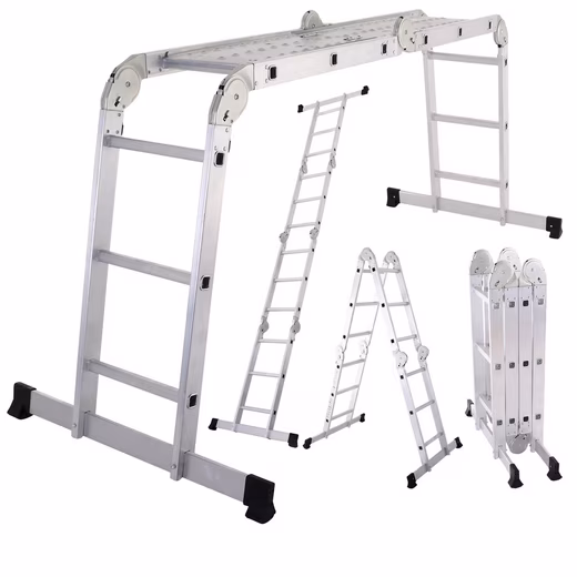 This foldable, multi-jointed aluminum ladder is a versatile and sturdy option for home, garden, workshop, and renovation projects. With three joints and 3×4 rungs, the ladder can be used as a leaning ladder, step ladder, or work platform. Two included extension plates allow for quick conversion to a platform with a height of approximately 89 cm.