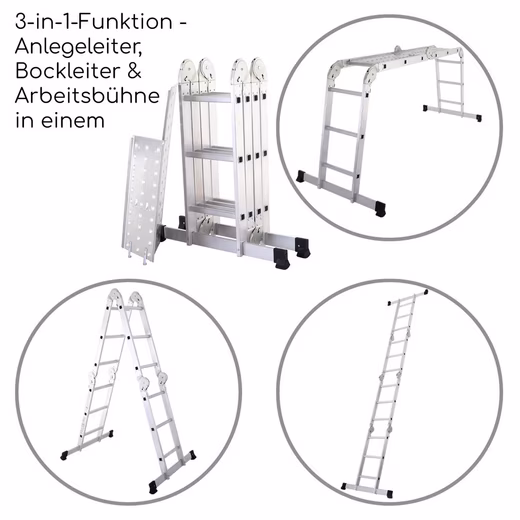 - 3-in-1 ladder: Can be used as a leaning ladder, step ladder or work platform – ideal for household, garden, workshop and renovation.