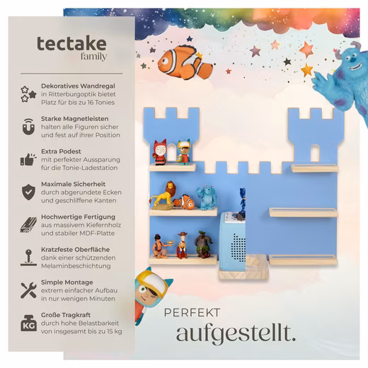 With the MyLittleStory Fortress wall shelf from tectake you not only bring more order to every playroom, but at the same time transform it into a knightly adventure land! Thanks to its unique castle design, it is guaranteed to make all children’s eyes shine and offers enough space for up to 16 Tonie figures.