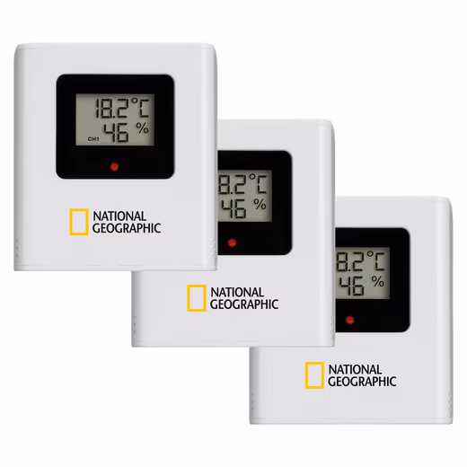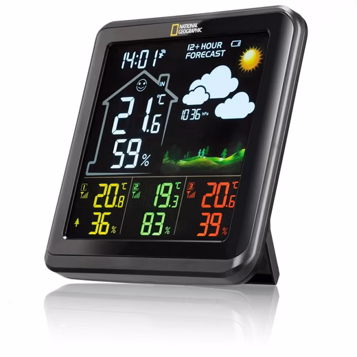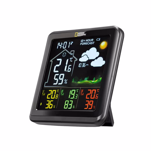 The  NATIONAL GEOGRAPHIC color weather station with 4 measuring ranges in black  displays all important weather information at a glance. Three remote thermo/hygro sensors are included as standard, allowing you to monitor not only the outdoor climate, but also, if desired, the climate in a child’s room, bathroom, bedroom, or even the basement. The station is highly versatile, as the temperature and humidity sensors are suitable for both indoor and outdoor use.  The clearly laid-out color display shows information such as indoor and outdoor temperature and humidity, as well as the precise time via DCF radio transmission and the current day of the week. Monitor up to 4 different locations for temperature and humidity with just one device.