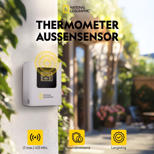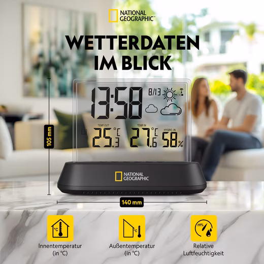 • Wireless weather station with transparent display: The NATIONAL GEOGRAPHIC weather station features a futuristic, transparent display with large digits that shows the outdoor and indoor weather conditions.