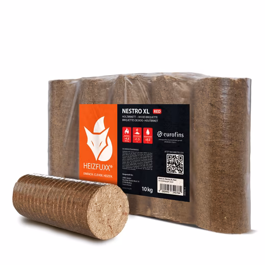 Nestro XL Red hardwood briquettes from PALIGO are high-quality fuels for efficient and environmentally friendly heating. Made from pressed hardwood shavings, they offer a long burning time and consistent heat output. They are COâ‚‚-neutral and an ideal alternative to fossil fuels. The briquettes are easy to store and handle, making them a practical choice for home heating. Ideal for fireplaces, stoves, and boilers.