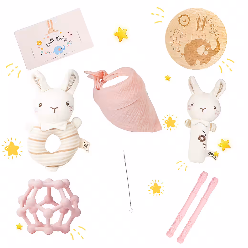 • Gifts for the birth of a boy. The 6-piece gift set includes: a rattle, bib, teething balls, teething tube, milestone cards and a greeting card.