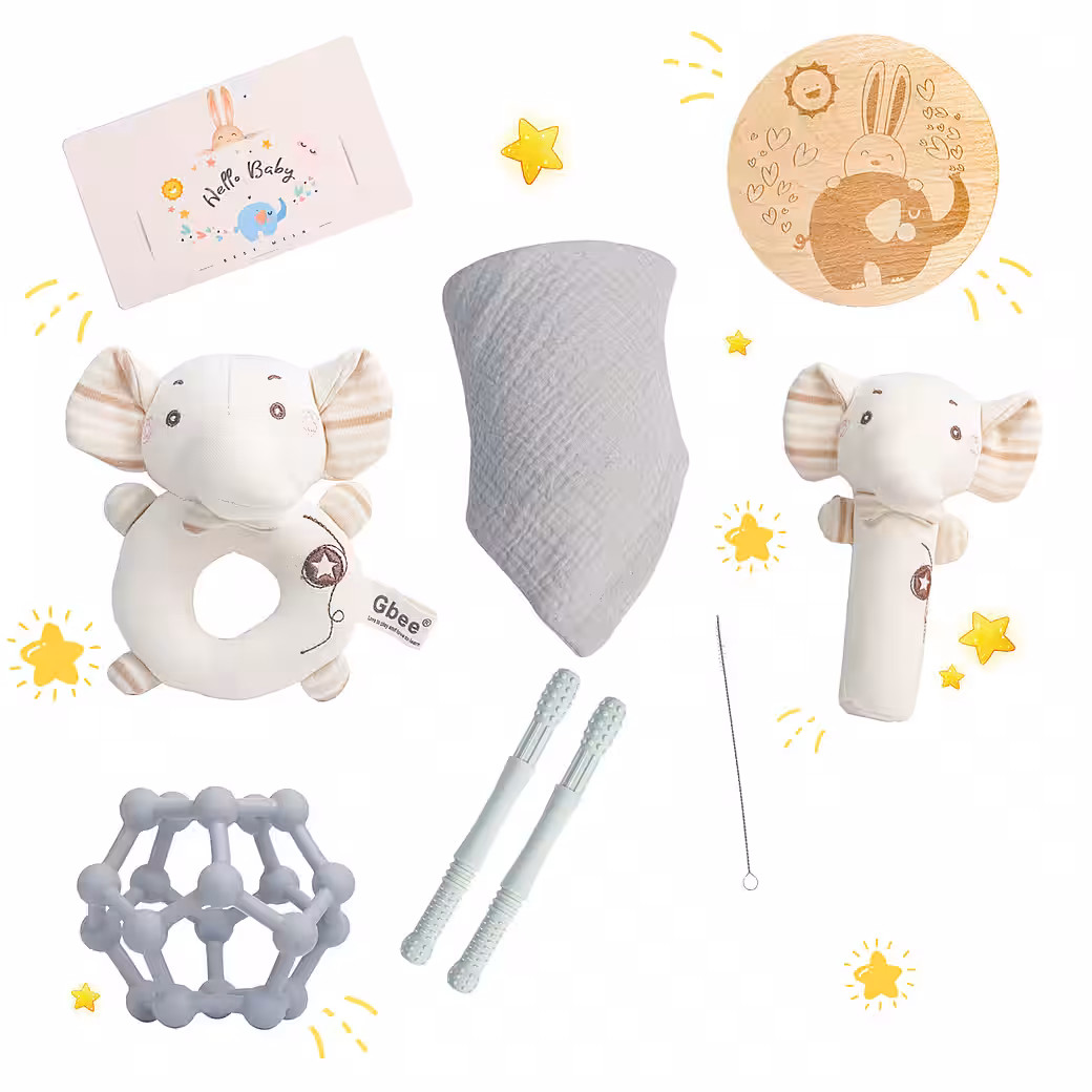 • Baby RattleThe elephant rattle toy set is a grasping toy that promotes fine motor skills.