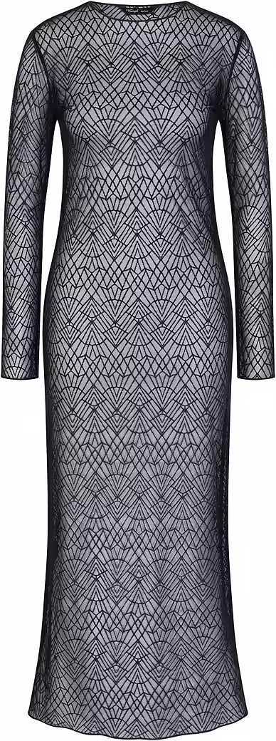 This sheer, long-sleeved dress with its sophisticated pattern promises unforgettable moments. This style, featuring sensual, stretchy, geometric lace made from 90% recycled nylon, is GRS certified.