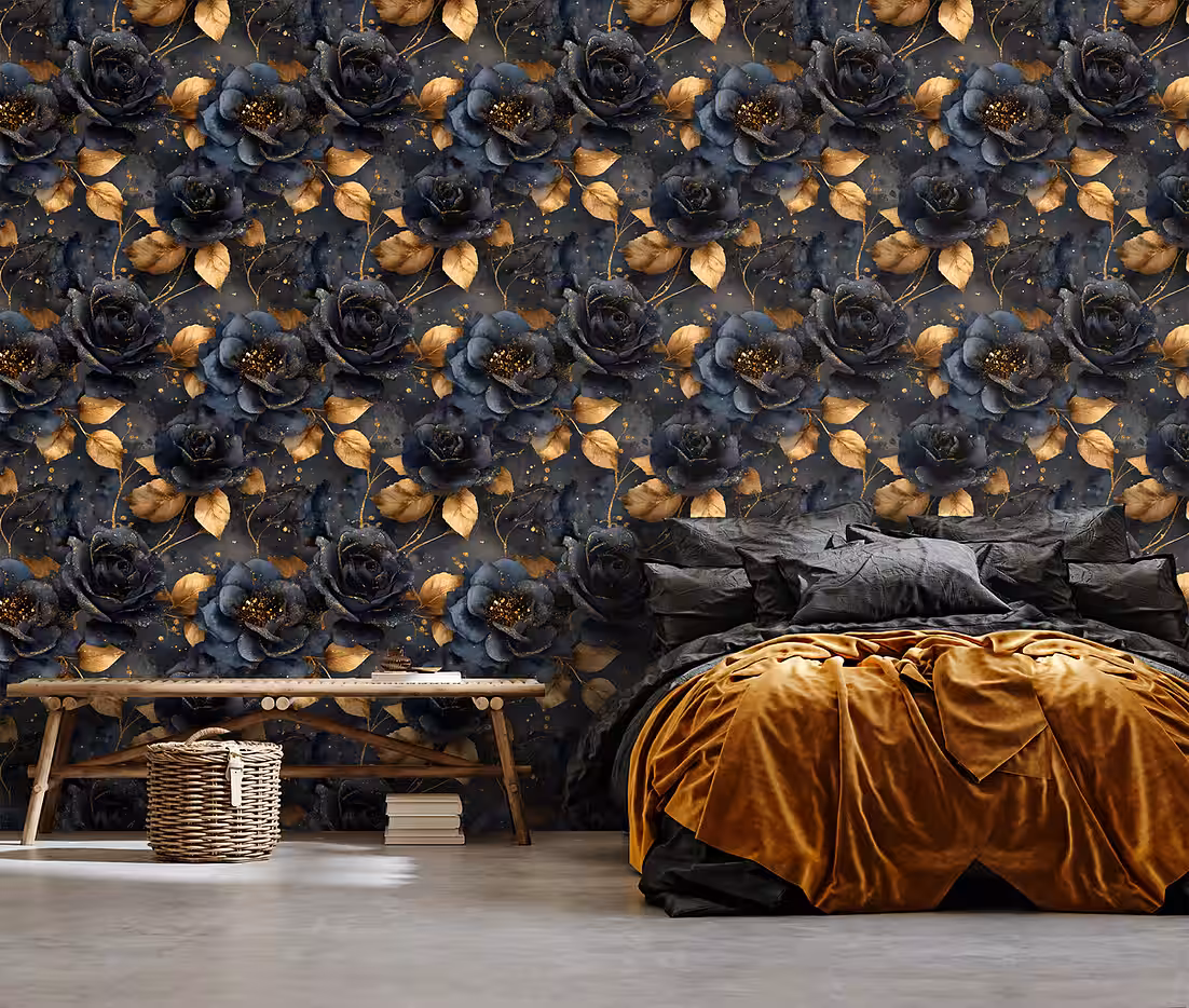Non-woven wallpaper, floral, black, gold, blue, living room, bedroom wallpaper