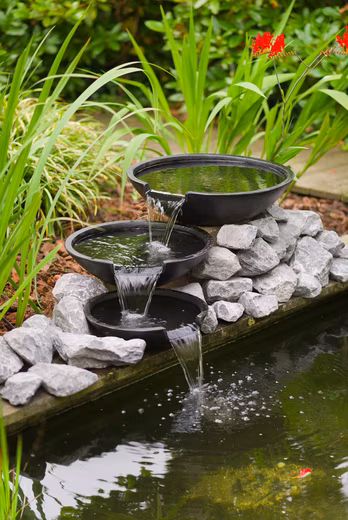 A small waterfall adds variety and life to your garden pond. Water cascades down three tiers of shallow bowls and flows back into the pond. This constant circulation oxygenates your pond, visibly improving water quality. Made of durable polyresin. A modern set, complete with pump and connection hardware.