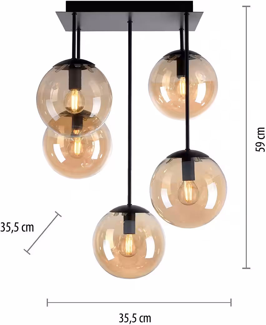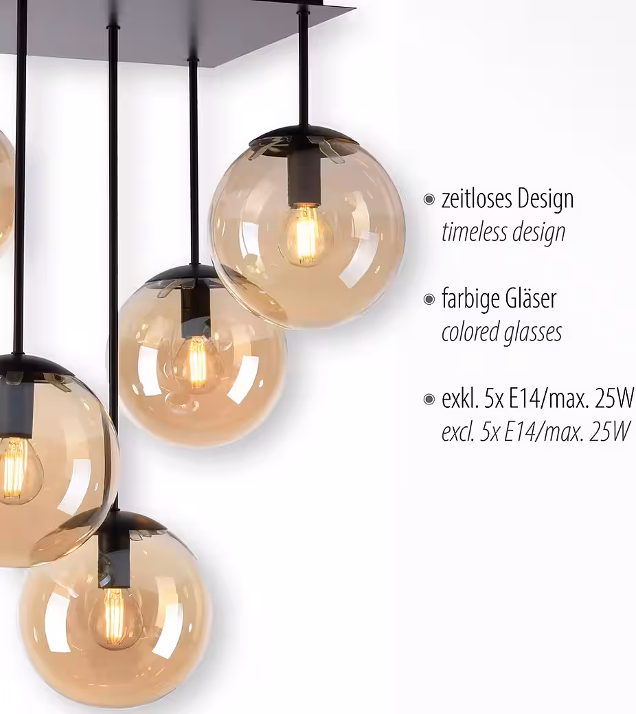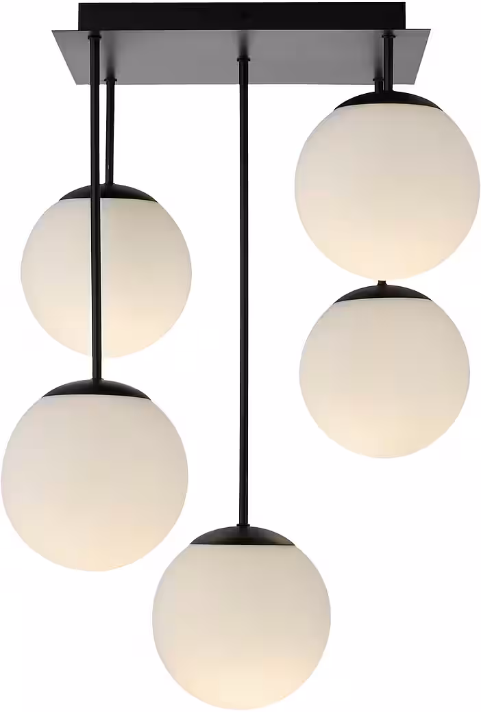 Experience timeless elegance and versatility with the NYMÖLLA ceiling light. This stylish black light comes with five glass shades that lend a harmonious and modern ambiance to any room. The ceiling light offers maximum flexibility in your choice of bulbs. It is designed for five E14 bulbs with a maximum wattage of 25 watts each, allowing you to tailor the lighting precisely to your needs. Whether you prefer warm white light for a cozy atmosphere or daylight white for clear, bright illumination – the choice is entirely yours. With its elegant black finish and glass shades, the NYMÖLLA fits perfectly into any living room, bedroom, dining room, or kitchen. The five glass shades are held in place by metal rods of varying lengths, each with a socket. Add a touch of elegance to your home and adjust the lighting to suit your requirements.
