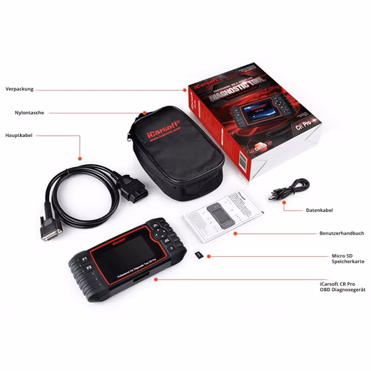 The iCarsoft CR PRO diagnostic tool is a professional, universal all-in-one device for error analysis and troubleshooting. The device supports more than 40 vehicle makes and models. The device is able to read the following: engine and transmission control unit, ABS, airbag, central locking, electronic parking brake, reset service and much more.
