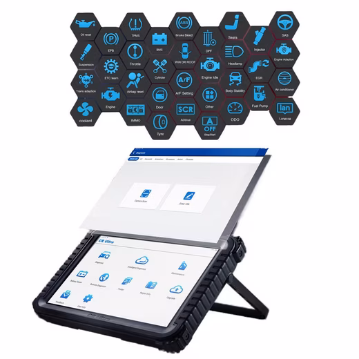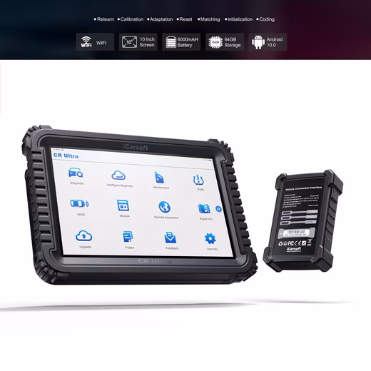 The iCarsoft CR Ultra is a powerful, Android-based diagnostic tool that supports a wide range of vehicle makes and models from 2000 onwards. With its 10-inch touchscreen, the device offers a user-friendly interface for advanced diagnostic functions. Supported functions include ECU coding, oil-light reset, TPMS programming, ABS bleeding and many other service functions necessary for efficient vehicle diagnostics. The software is easy to use and makes it possible to read and delete fault codes, monitor live data and maintain the vehicle with numerous reset functions. The device is ideal for mechanics, workshops and hobbyists who need precise and comprehensive diagnostics. It also supports over-the-air updates, thus providing long-lasting use with minimal maintenance.