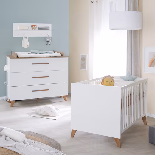 - MODERN BABY FURNITURE: The set consists of a convertible crib (70×140 cm) and a changing table – visually in timeless white with wood decor in Wotan oak.