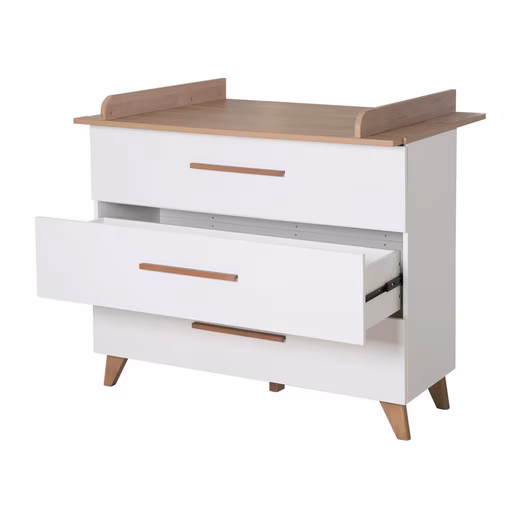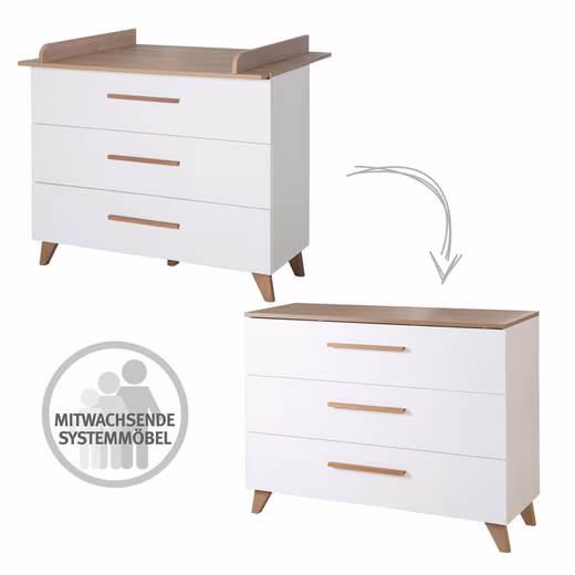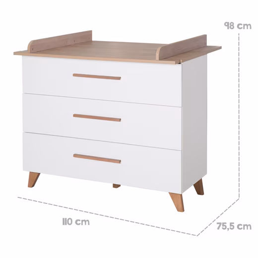 - Changing table with detachable extension: Can later be used as a chest of drawers in the children’s room – Large storage area thanks to 3 fully extendable drawers