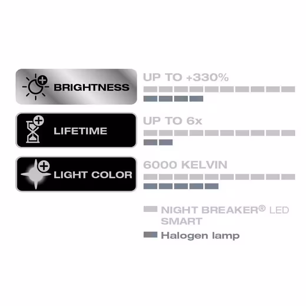 The new NIGHT BREAKER LED SMART from OSRAM impresses with exceptional brightness, an innovative compact design, and versatile application possibilities. Thanks to its high compatibility and impressive longevity, it is the ideal choice for road use. Experience the next generation of OSRAM technology and discover completely new possibilities in the world of approved LED retrofit lamps with the NIGHT BREAKER LED SMART.