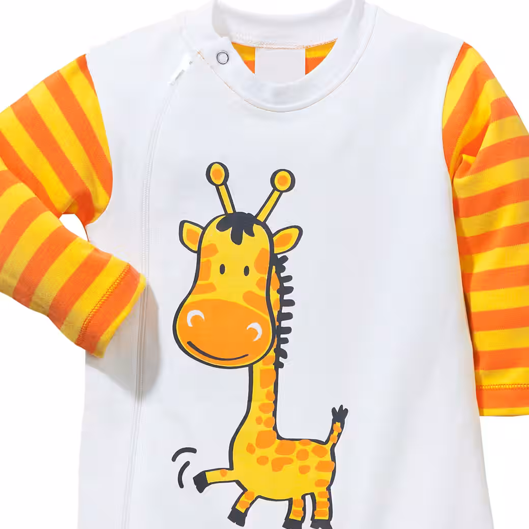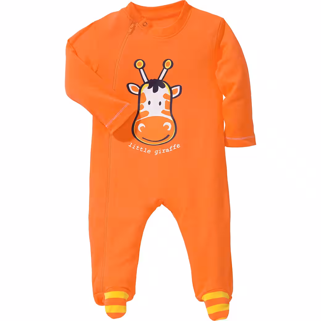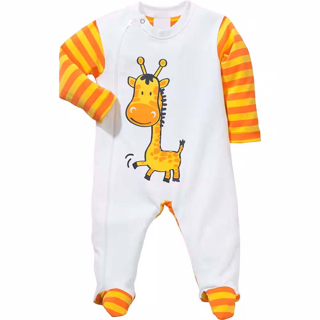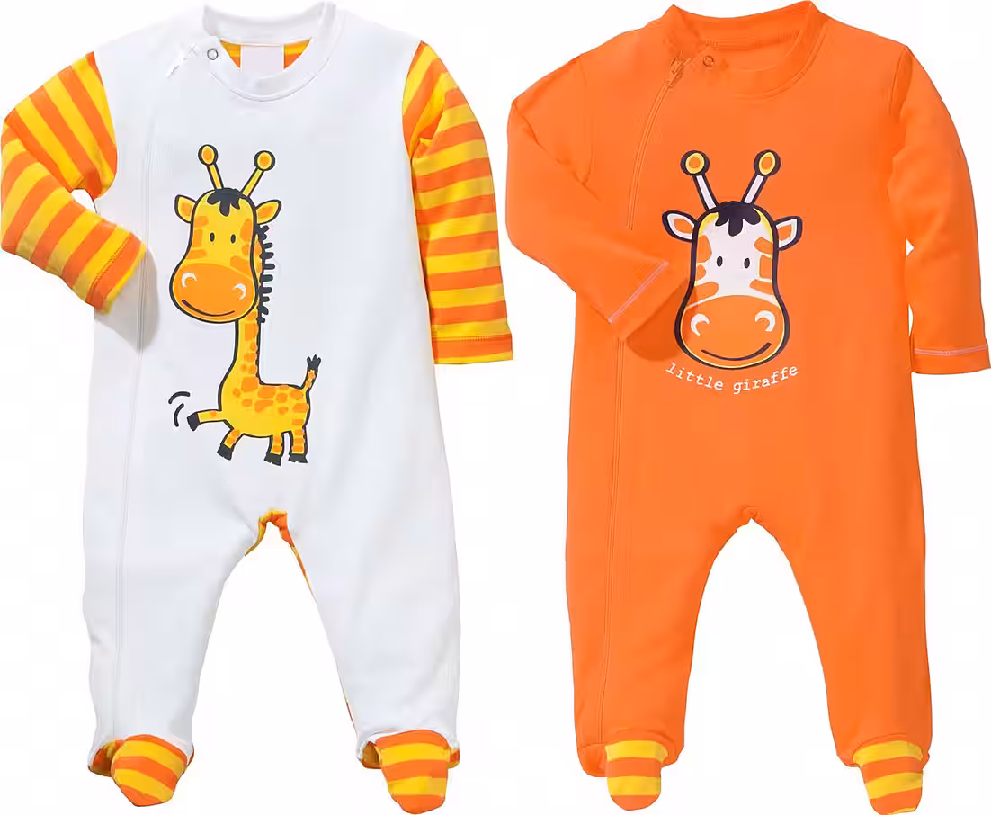 Erwin MuellerInterlock jersey baby pajamas in a pack of 2. Lovingly crafted with cute giraffe print and knitted rings. Your darling will definitely like the sweet designs. Long zippers make it easier to put on and change diapers. The soft feel-good quality is a pleasure on the sensitive baby skin.