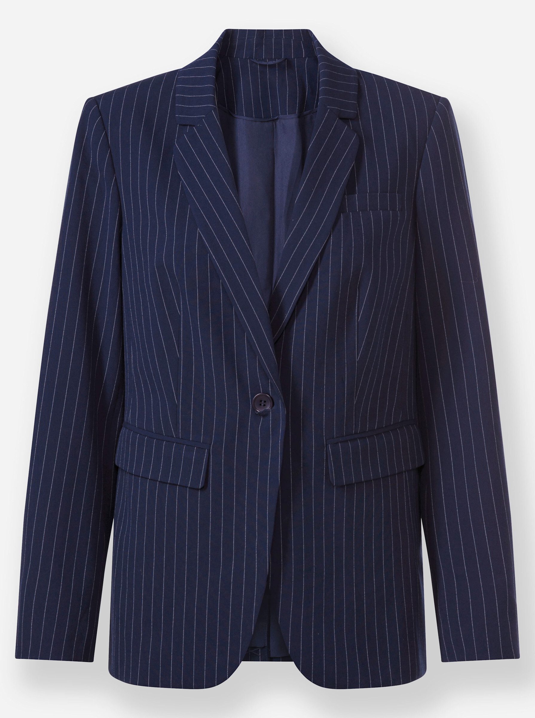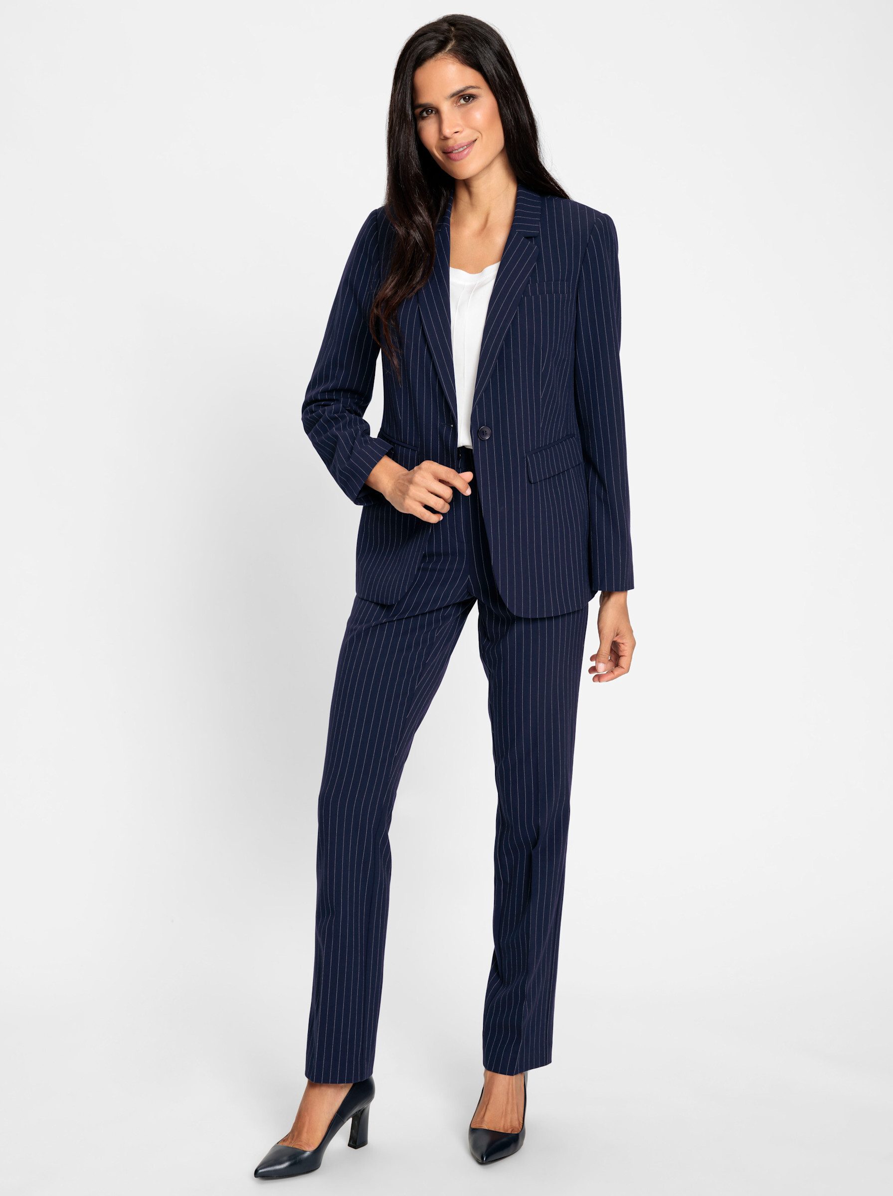 Pantsuit: A perfect look in elegant pinstripes. Shape-retaining, comfortable stretch fabric. Blazer: with lapel collar, button closure, flap pockets, and light shoulder padding. Long sleeves with decorative buttons at the hem. Back vent. Length approx. 70 cm. Pants with belt loops, straight leg, and front pockets. Regular rise. Regular fit. Ankle width approx. 40 cm.