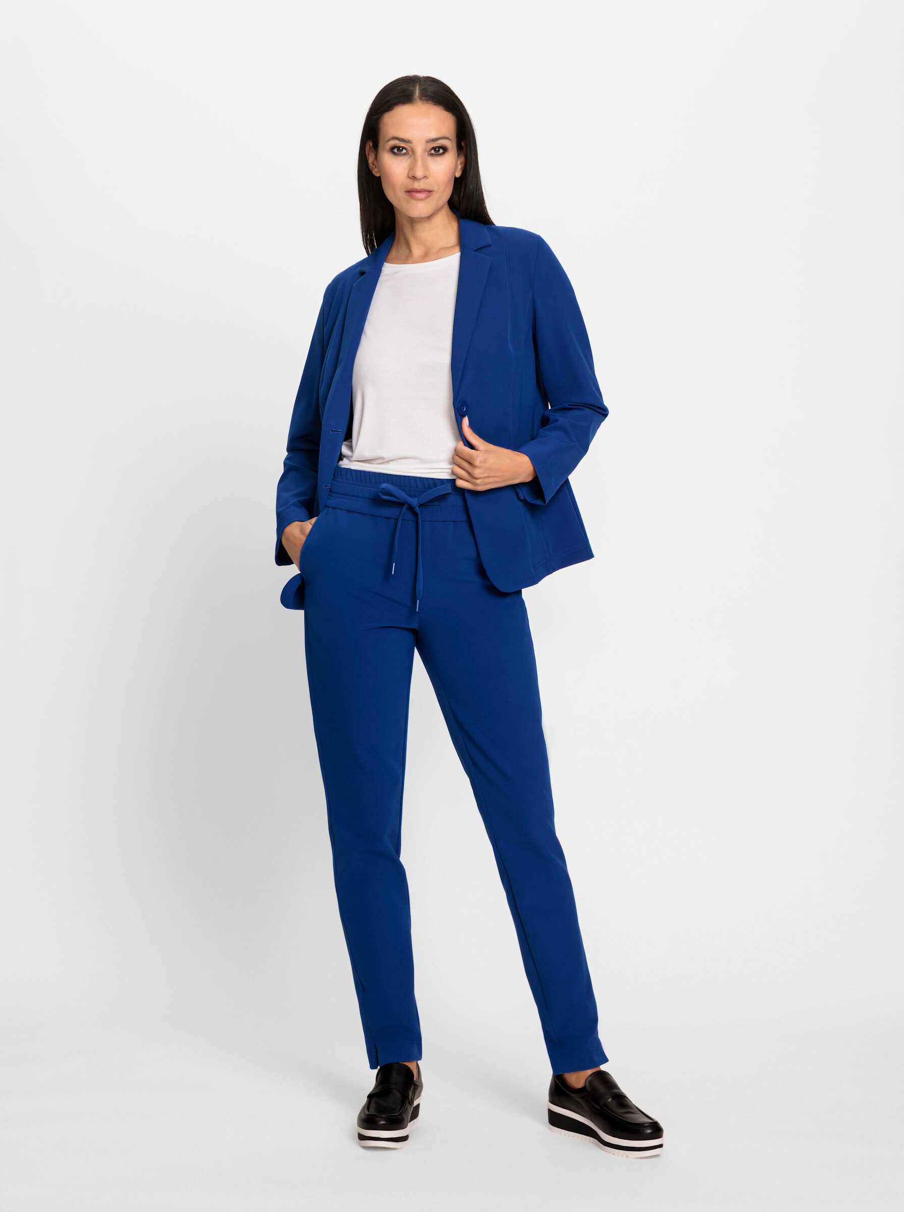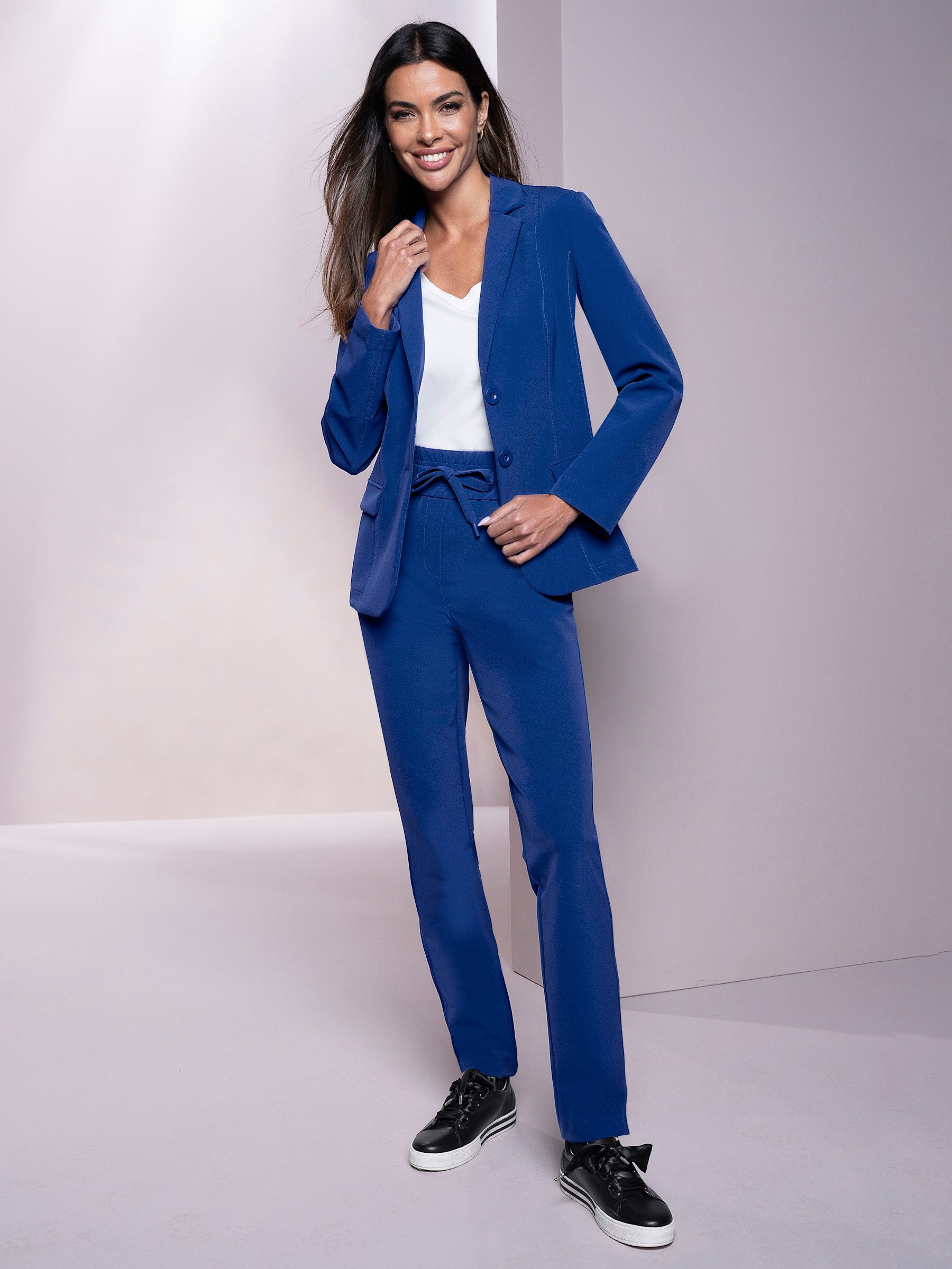 Comfortable and stretchy pantsuit. Single-breasted, two-button blazer with a fashionable lapel collar and decorative flaps. Jogger-style trousers with a drawstring at the wide, all-around elastic waistband. Side pockets and decorative buttoned flaps at the back. Comfort fit. Regular rise. Inside leg length approx. 77 cm.
