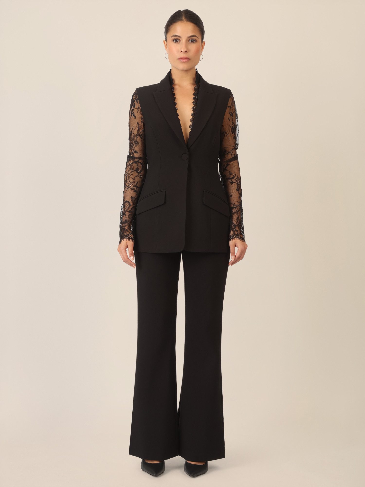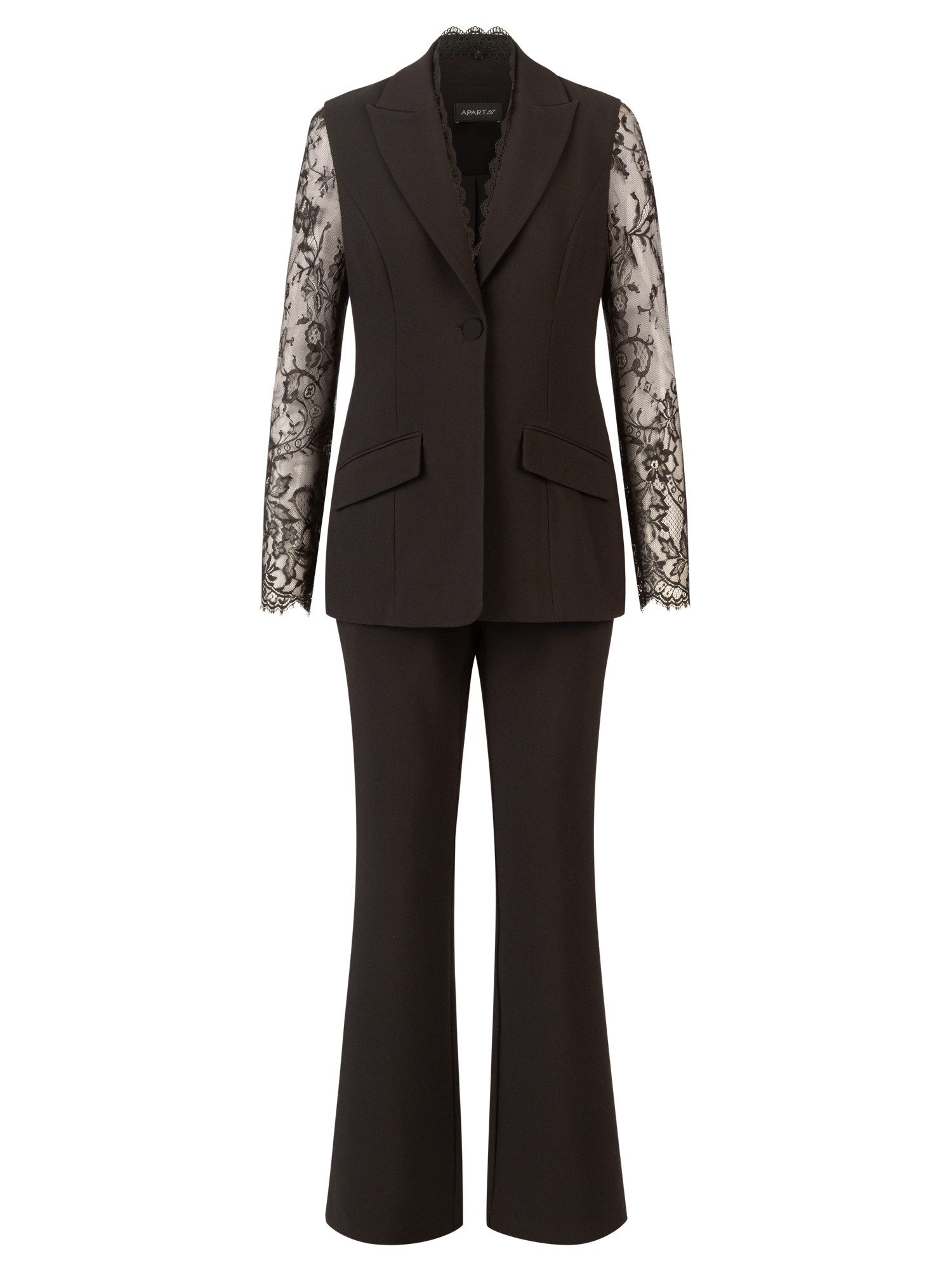 A pantsuit that combines classic tailoring with romantic details. The figure-hugging blazer features deep, peaked lapels and a detachable lace trim along the neckline—a sophisticated yet versatile highlight. Refined dividing seams precisely shape the top and emphasize its feminine lines. Slanted flap pockets at hip height add practical accents, while a back slit ensures freedom of movement. The long sleeves made of transparent, soft lace end in a delicate scalloped edge—a stylish contrast to the structured, fully lined body. The matching trousers boast an elegant bootcut silhouette and finely coordinated details: a shaped waistband with lace appliqués meets classic belt loops and a concealed hook closure. Slanted pockets complete the design for everyday wear. This two-piece suit is a modern classic—sophisticated, feminine, and with great attention to detail. Blazer length approx. 68 cm, side length of the trousers approx. 108 cm.