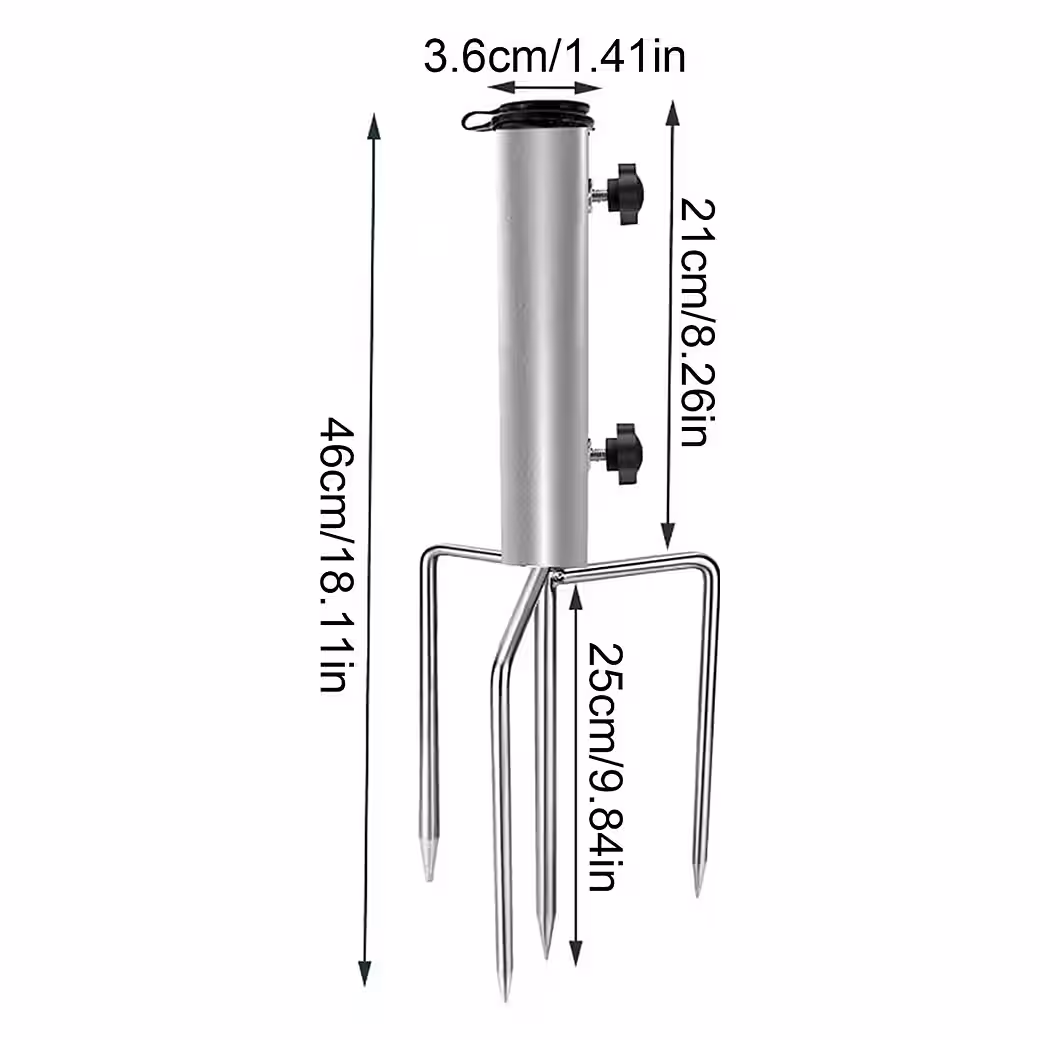 The umbrella stand has a total length of 46 cm and a ground spike of 26 cm. The installation tube measures 21 cm and has an inner diameter of 3.6 cm. The adjustable screws allow for flexible adjustment to different diameters. The umbrella stand is easily disassembled and can be conveniently stored in a backpack or handbag.