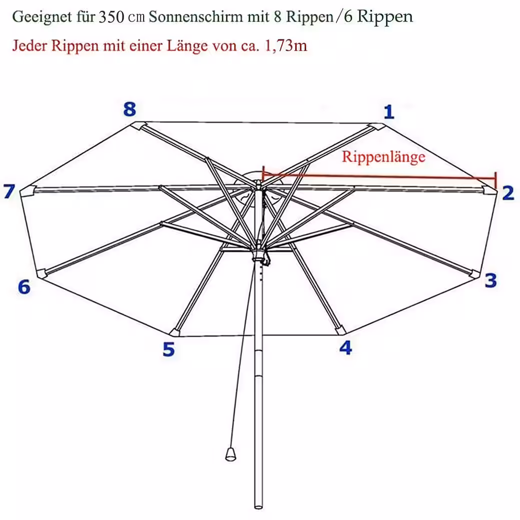 - Windproof & durable: With its stable 350 cm canopy construction and 8 ribs, the cover offers additional stability – ideal when the wind blows stronger.