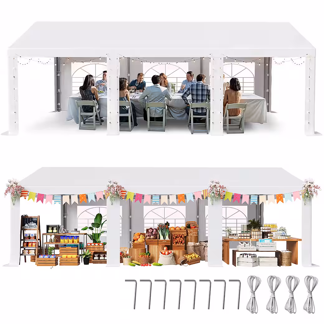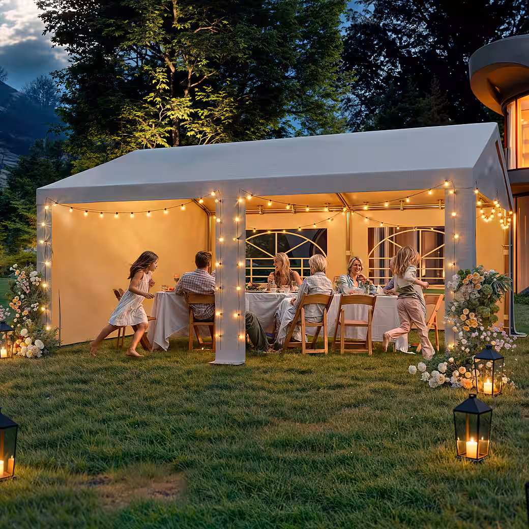 The tent frame is made of fully galvanized steel tubing. The galvanizing process gives the tubing a robust, rust-resistant coating, extending its lifespan and making it resistant to harsh outdoor environments. This prevents rust and damage, even after prolonged exposure to humid air. At the same time, this material provides the tent with excellent stability. The high strength and toughness of the steel tubing allows it to withstand a certain degree of wind and external pressure, ensuring the tent can withstand all kinds of weather conditions and provide reliable support for your parties.