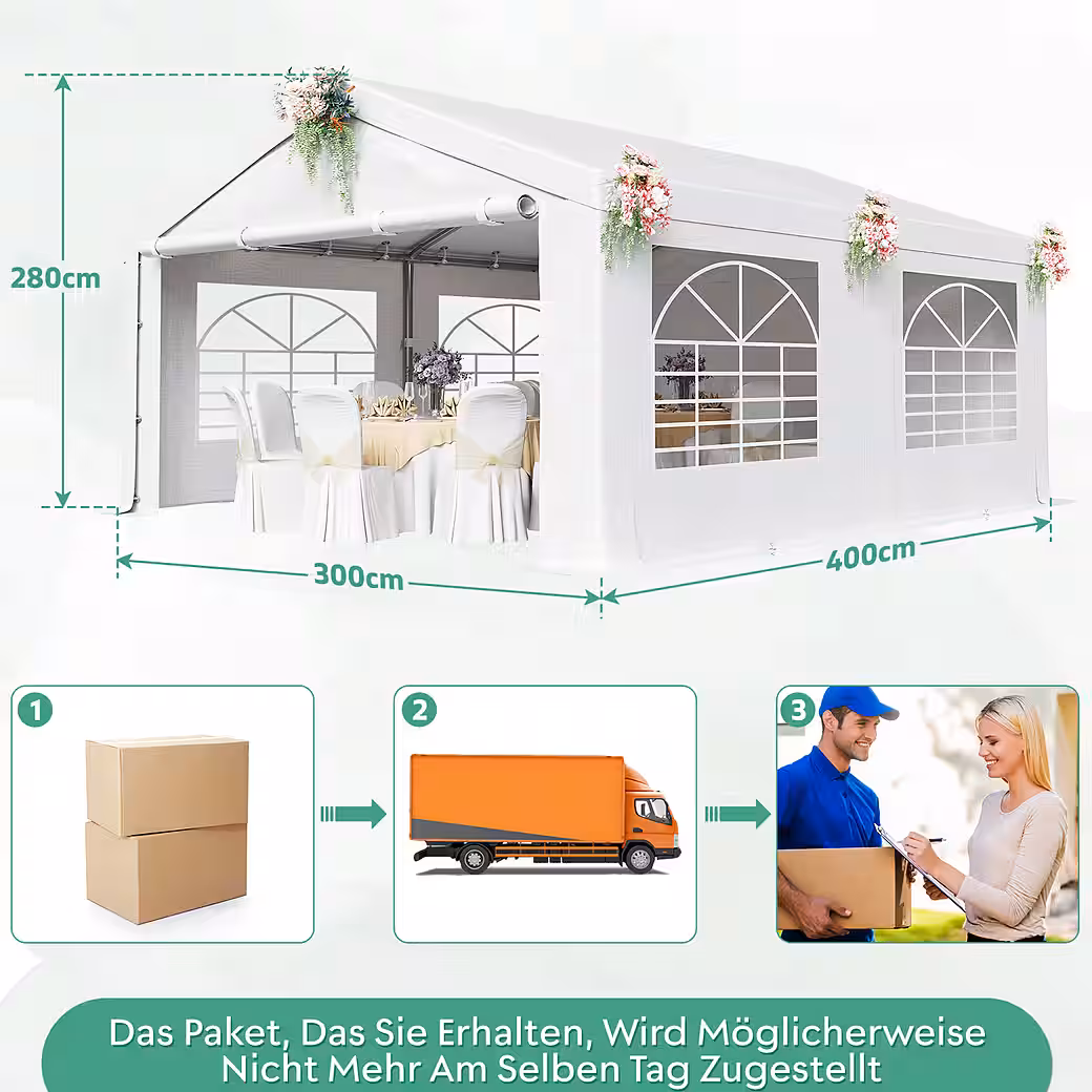 This party tent offers a comprehensive range of accessories. In addition to its sturdy steel frame, efficient waterproof roof, and side panels with transparent PVC windows, it features a canopy with an entrance for easy and convenient access to your event. The tensioning straps further enhance the tent’s stability and ensure secure anchoring to the ground in windy conditions. Hooks provide additional hanging space for decorations or frequently used items, increasing both the tent’s practicality and aesthetic appeal. Detailed assembly instructions are also included for easy setup.