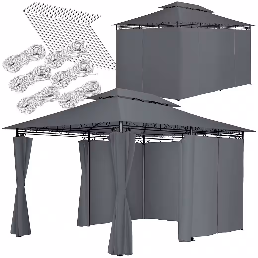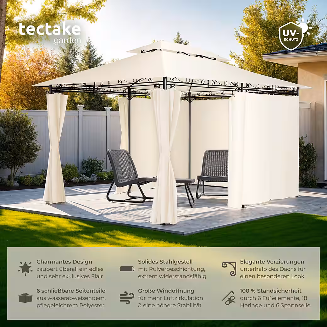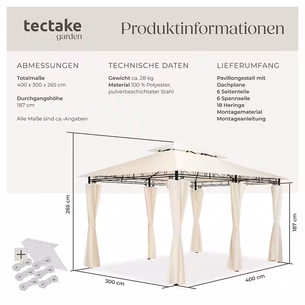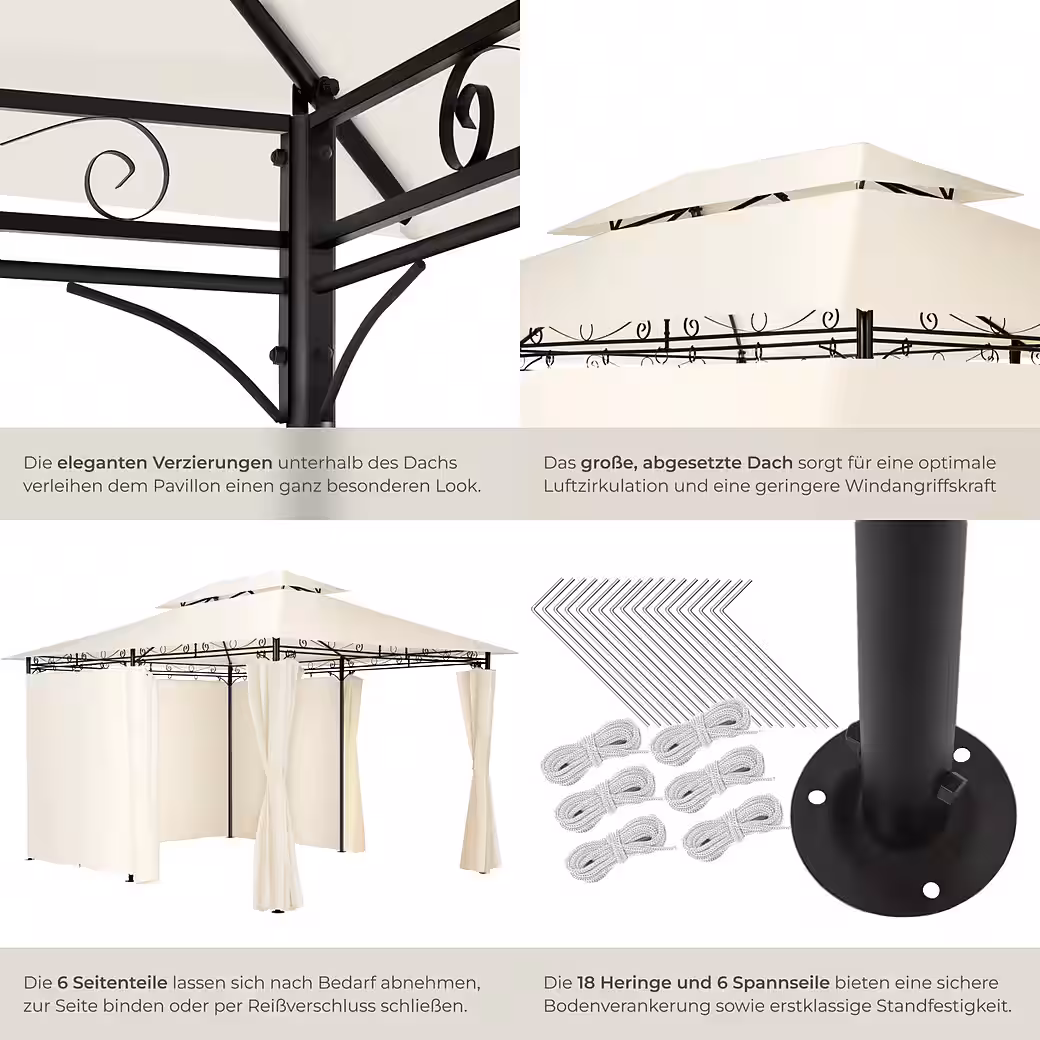 | Scope of delivery | 1 garden pavilion, 6 side panels, 18 ground stakes, 6 guy ropes, assembly material |