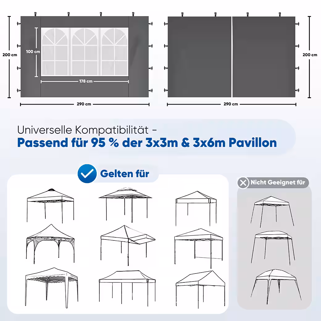 - Versatile compatibility: Fits 3×3 m and 3×6 m folding gazebos. Side panel size: 200 cm × 290 cm, perfect for various setup options.