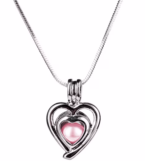 The shell pearl will lie safely in the silver-colored pendant. Remove the pendant from the chain, only then can you open it. Now insert the pearl.