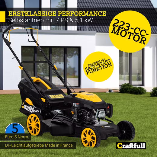 Self-propelled lawnmower. Maximum efficiency with economical fuel consumption: This lawnmower, with its 223 cc engine producing 5.1 kW (7 hp), is a true powerhouse. The DF smooth-running transmission, combined with the strong self-propulsion, ensures consistent performance without effort. The Euro 5 standard confirms its low emissions.