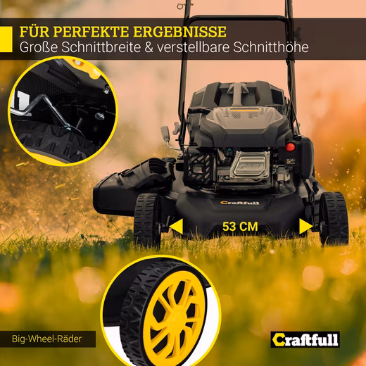 Adjustable cutting height. The Craftfull Premium petrol lawnmower CR-224-30 impresses with its powder-coated steel body and a 53 cm cutting width. This allows you to finish faster and save time – even on larger lawns. The cutting height can be adjusted in seven increments from 30 to 95 mm.