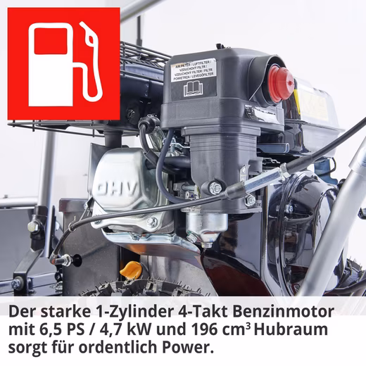- 196 cm³ 4-stroke engine with 4.7 kW (6.5 hp) power at 3600 rpm