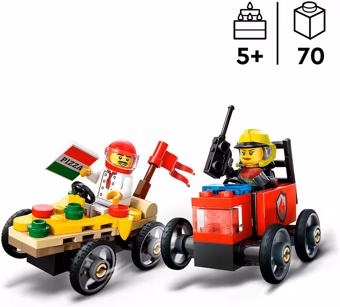 - Includes 2 soapbox cars (pizza slice and fire engine) and 2 driver minifigures.