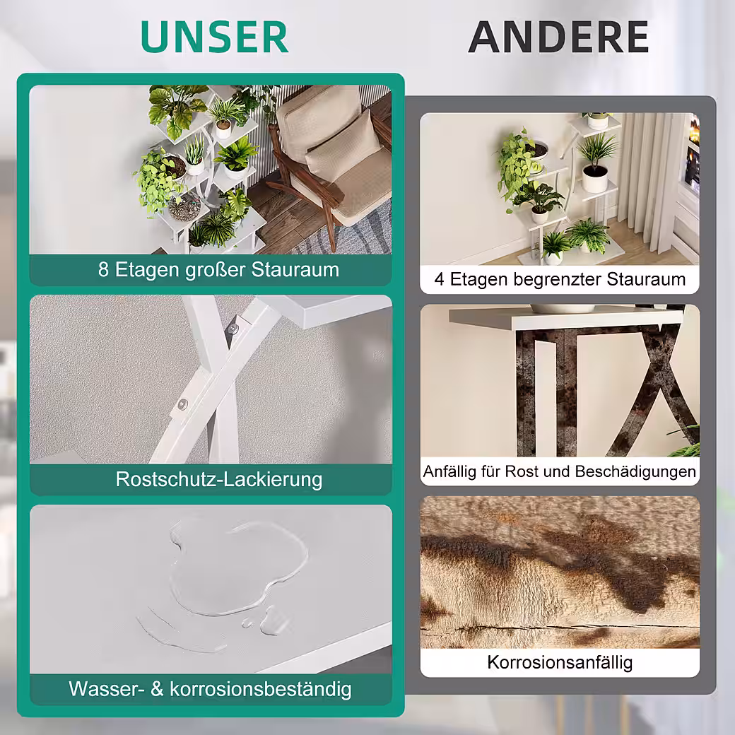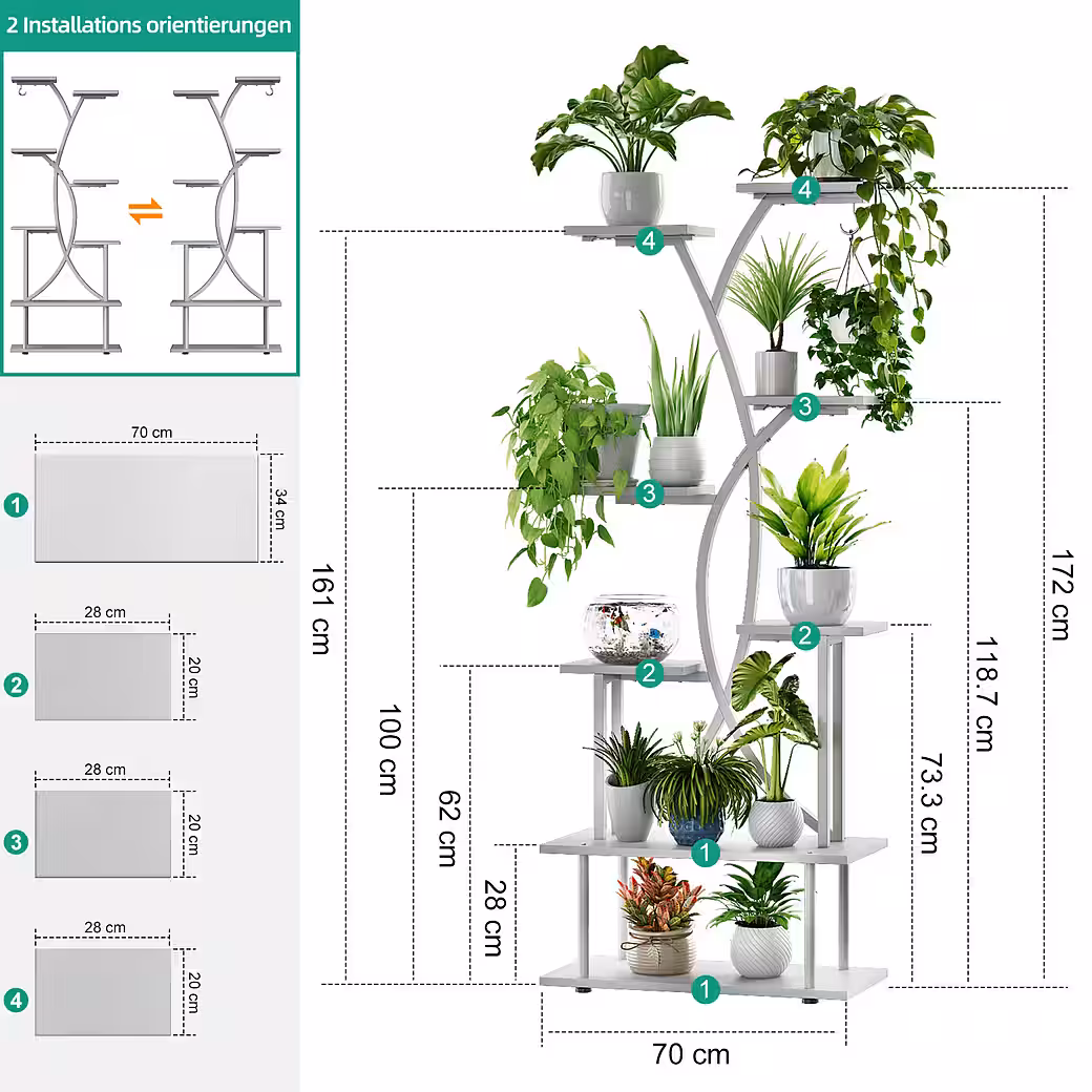 • 8 levels, high load capacity: Flexible heights for plants of all sizes. Each level supports up to 45 kg – stable, safe and versatile.