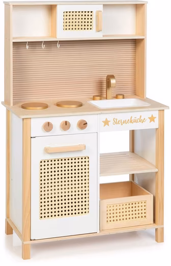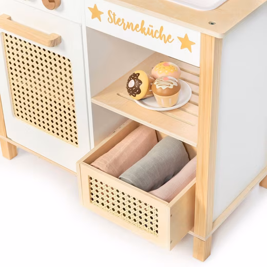 • Trendy wooden play kitchen in the popular boho style with beautiful wickerwork.
