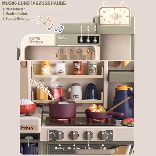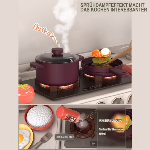 This play kitchen with lights and sounds features many interactive elements that make playtime even more exciting and realistic. The playset also includes battery-operated light and sound effects located on the induction cooktop. Simply turn the control knobs to activate the functions. When you add water, the induction cooktop will release steam while cooking, just like a real induction cooktop. Place water in the children’s sink, press the tap to dispense the water, and it will circulate in the sink, allowing for repeated use. This beautiful children’s kitchen encourages role-playing, helping children improve their fine motor skills and express their imagination.Â