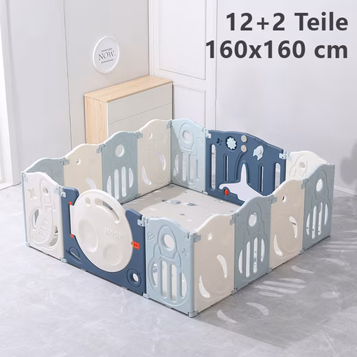 This spacious baby playpen offers a safe play area for your child with its dimensions of 160x160x60cm. The practical construction consists of 14 sturdy panels in attractive blue and pink tones that can be easily opened and folded. An integrated door with a safety lock from the outside allows convenient access. Particularly practical: The playpen does not require any complex assembly and stands securely on the ground thanks to powerful suction cups and anti-slip caps. The durable plastic material is robust and easy to clean. The thoughtful construction provides ample space to play and explore, while giving you peace of mind that your child is in a safe environment. The harmonious colour combination of blue and pink blends discreetly into any children’s room.