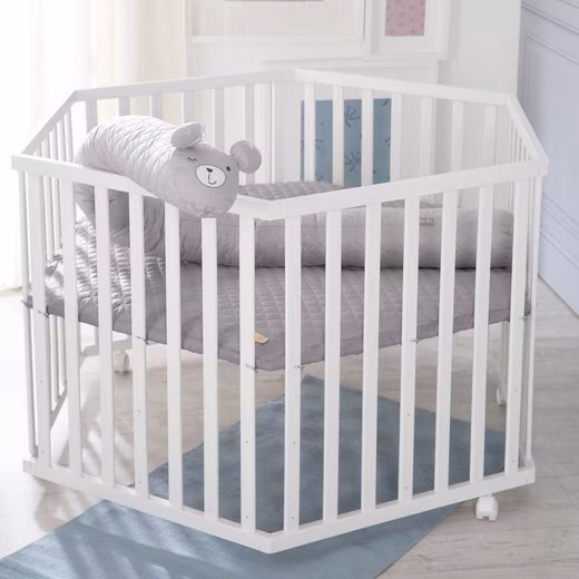 6-sided playpen with fabric insert and a bed snake |