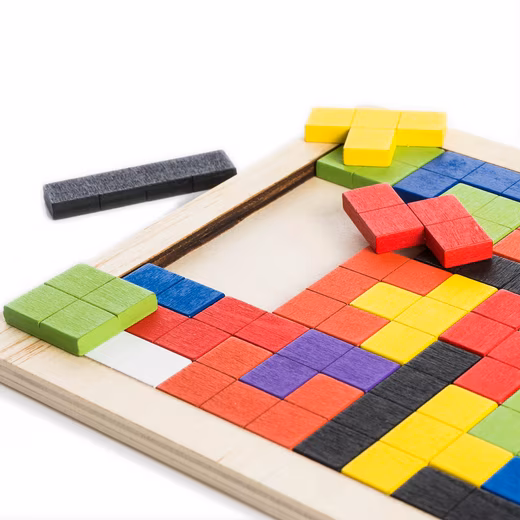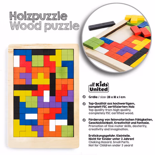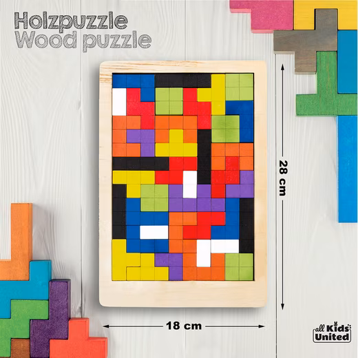 To play the building block puzzle, simply pour out the game. Now you have 40 pieces of colorful blocks that have to be placed on the wooden board. So that in the end all the pieces of the puzzle have found their place and there are no gaps left. Please note that there are several ways to solve the problem. In this way, new solutions can always be found. Similarly, your child can use the template and puzzle pieces to present a variety of graphics.