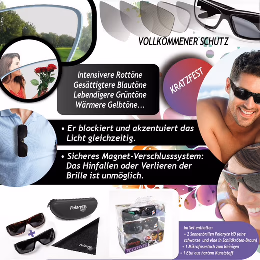 In addition to providing an outstanding visual experience, Polaryte® HD sunglasses also offer first-class protection for your eyes and the delicate skin around them. Thanks to integrated Diamond Vision technology, your eyes are perfectly protected from harmful sun and UV rays. Polaryte® HD sunglasses are also extremely practical and durable. With the integrated magnetic clip, you can always keep your shatter- and scratch-resistant sunglasses safely with you. This set of two also offers you the opportunity to vary your style and be on the go with revolutionary technology. Discover the difference with Polaryte® HD sunglasses – the perfect combination of protection, clarity, and style!
