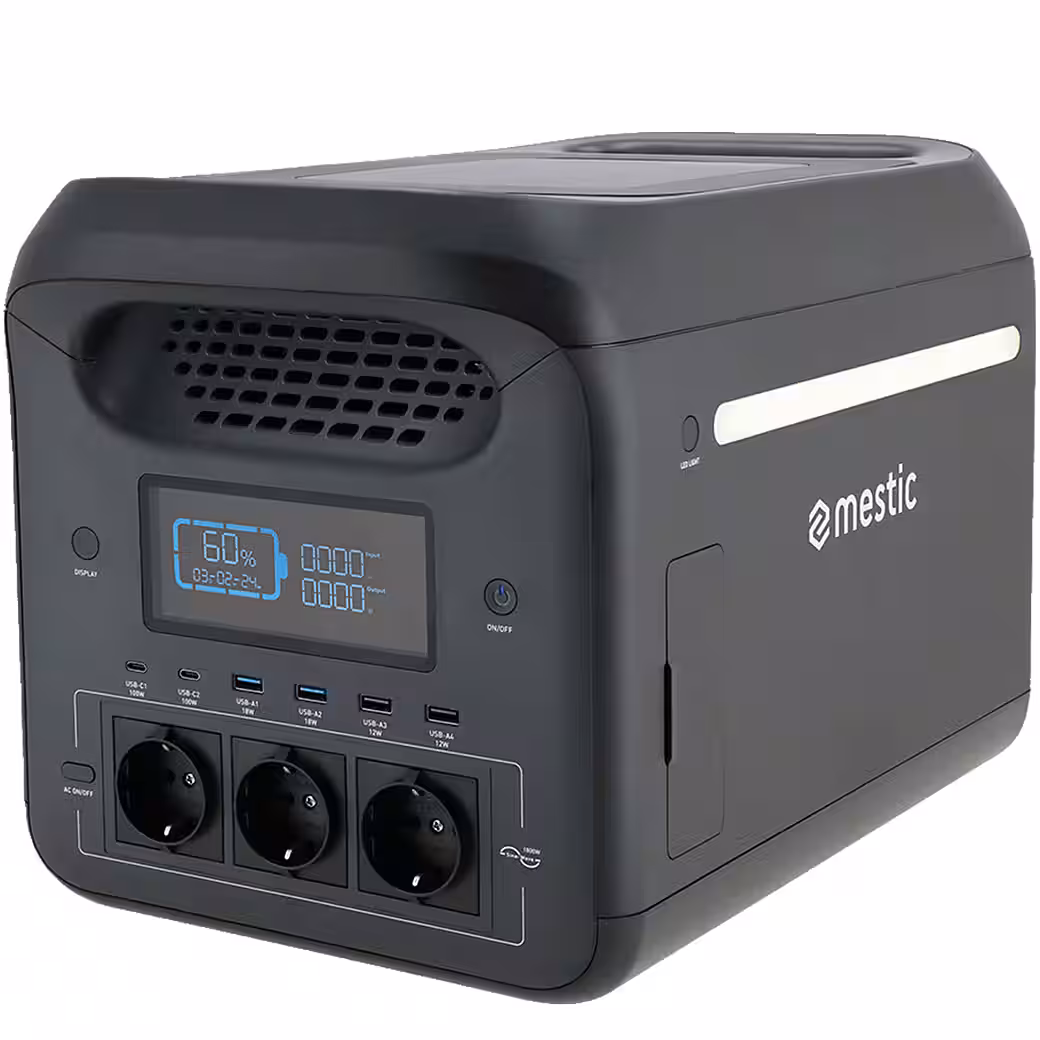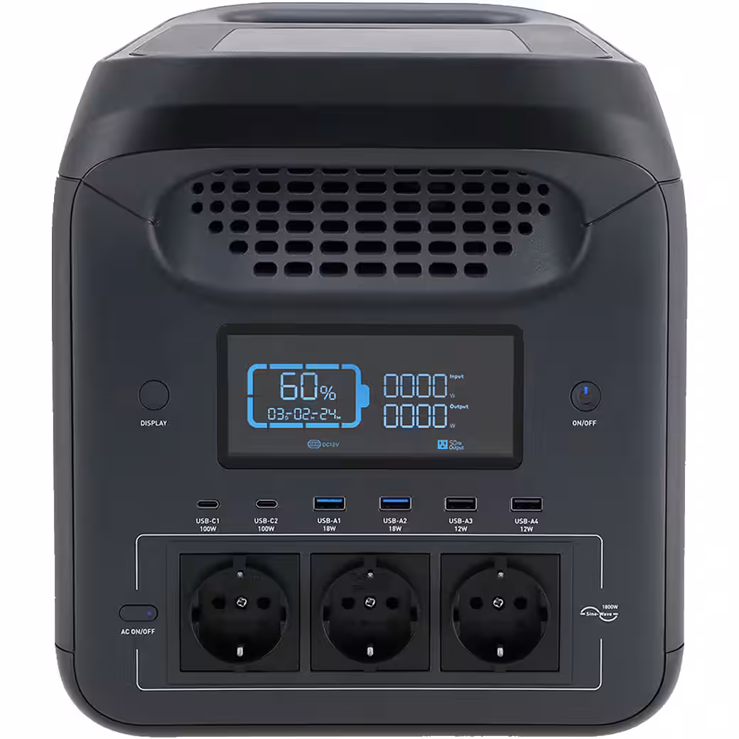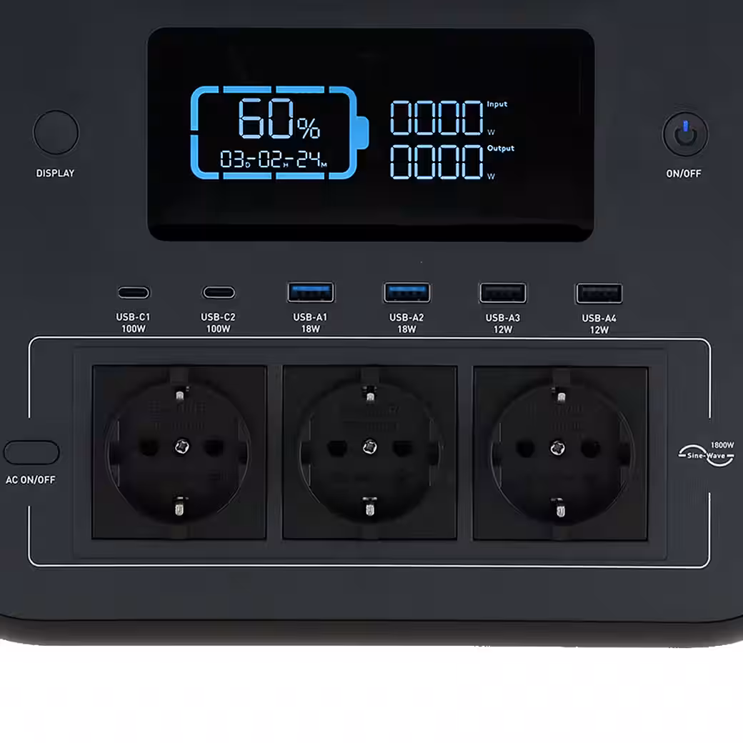 - Output: 3 x AC / DC / 2 x USB-A / 2x USB-C 12 W / 2x USB-C 18 W. Peak power: 3000 W. Rated power: 1800 W. Battery: 1226 Wh (Lithium LiFePO4)