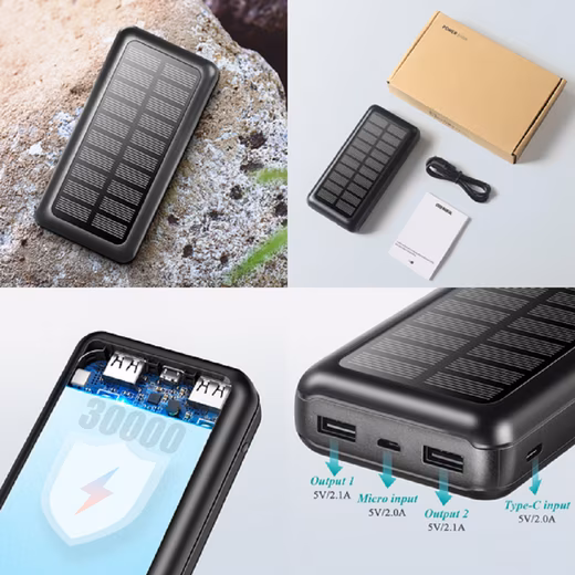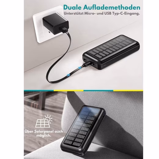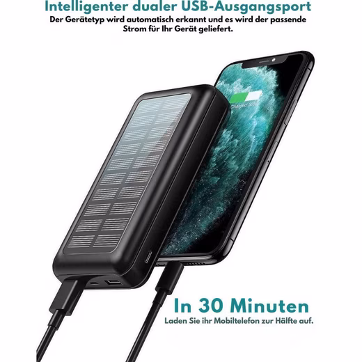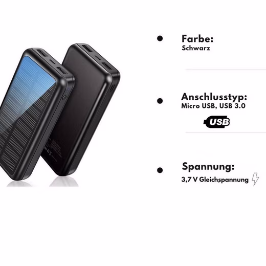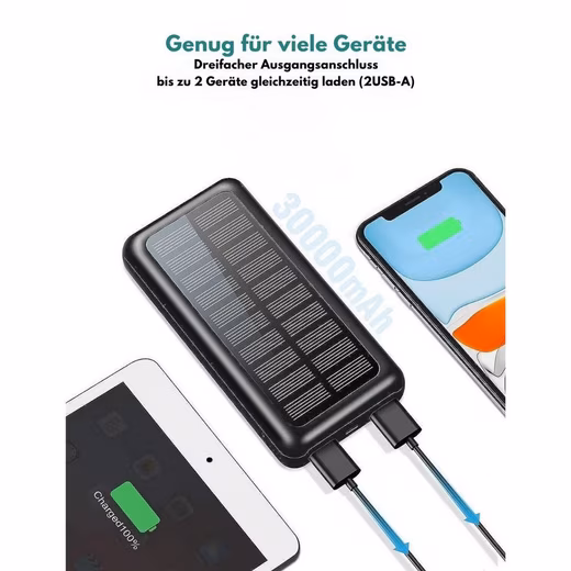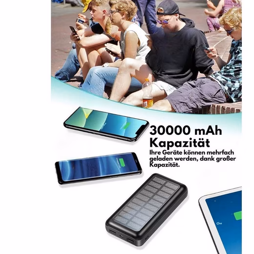 30000mAh Solar Powered Power BankThe 30,000 mAh solarge-powered power bank is the ideal accessory for all your outdoor activities, be it beach trips, camping, hiking, fishing, climbing, boating or other adventures. With its high capacity, you can charge several devices several times and are therefore always well equipped.