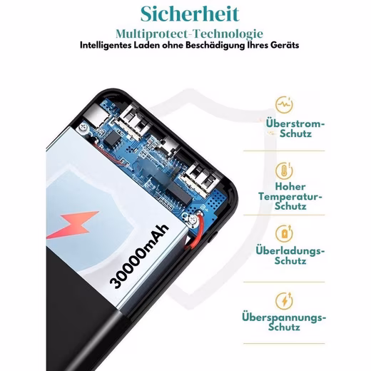 In addition to the robust 30,000 mAh power bank, the package also includes an optimized charging cable for fast charging times and a detailed user manual. With dimensions of 14.5 x 7.2 x 2.7 cm and a weight of 436 g, the power bank is compact and easy to transport.