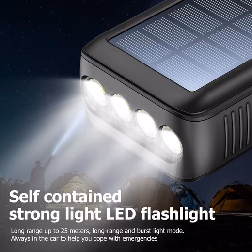 20000mAh super large capacity solar power bank. So you can get rid of the fear of battery power anytime and anywhere. Built-in 4 LED flashlights with 3 modes (lights/flashing/SOS), which can be used as a camping lamp, emergency lamp and rescue signal lamp. Equipped with a solar panel, simply hang it on your backpack to charge it by sunlight. It is perfect for outdoor activities such as camping, hiking, and other emergencies.