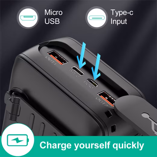 With two input ports (high-speed Type-C and Micro), the solar power bank can be fully charged in 9-12 hours. The mobile power supply features a hand-crank charging design. No sunlight, artificial power generation can be used as an emergency role. (Please note: Charging by hand crank and solar energy is intended for emergencies. Do not use solar energy as your primary charging source. It is highly recommended that you fully charge the device via a wall charger when you use it for the first time.)