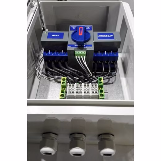 ATS box for automatic home emergency power supply – Reliable and Universal The ATS box (Automatic Transfer Switch) is the universal solution for an effortless home emergency power supply. With an impressive response time of 2-7 seconds, it switches on automatically as soon as the mains power fails, ensuring uninterrupted operation of the house. Automatic transfer switch with manual setting The ATS box offers the flexibility of a manual setting and has a switching time of approx. 2 seconds. Produced in Germany, it is suitable for both 1-phase and 3-phase systems. The connection takes place with the same phases between mains power and emergency power. Function when mains power is available In the event of mains power availability, the ATS box automatically switches off the power supply and supplies the house with the mains power. ATS box technical data: • Size: 400x300x170mm • Protection class: IP54 • Housing material: ABS • Cable Diameter: Main Line 4-25 ² / 4-16mm², Control Line 0.5-2.5mm²/ 0.5-1.5mm² Scope of delivery: • ATS-Box • 3 pieces Cable Gears • Circuit diagram • Assembly and operating instructions • Declaration of Conformity Assembly and operating conditions: The ATS-Box is designed for interior use and can operate at temperatures from -5 to 40°C and an installation height up to 2000m above sea level. The tightening torque of the terminals is 2.8 Nm for main conductor terminals and 0.5 Nm for control terminals. Technical parameters: • Mains current Network: 63A • Rated current Network: 32A • Trigger current: 5-10In (Type C) 10-15In (Type D) • Mains voltage: 230V / 400V 4-pole ± 10% • Mains frequency: 50/60Hz • Rated short-circuit current Icm (peak): 6.615kA • Rated short-circuit current Icn (effective value): 4.5kA • Utility category: AC 33B • Switchover duration: <2sec • Power consumption Normal operation: <1W • Power consumption maximum: <2sec approx. 30W Important note: The ATS-Box should only be connected to the generator and fuse box by specialist personnel. It should be noted that the ATS box can be used universally for all generators with an electric starter function. Depending on the model, a time delay relay may be required, but this can easily be switched between by an electrician. The ATS box is the ideal solution for a reliable and automatic home emergency power supply – easy to install and flexible to use.
