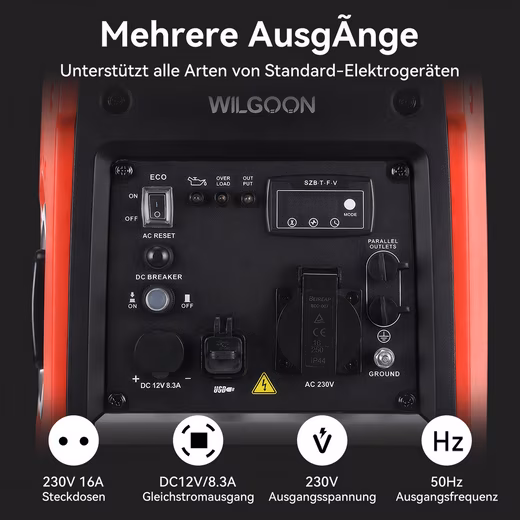 • 230V sockets including voltmeters show the available voltage for connecting end devices. Automatic voltage control (AVR) ensures stable output power