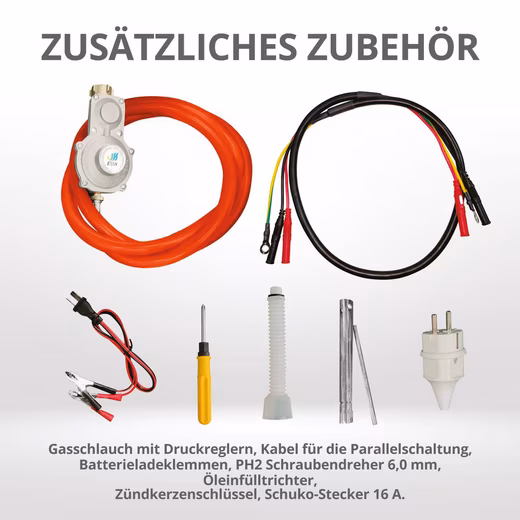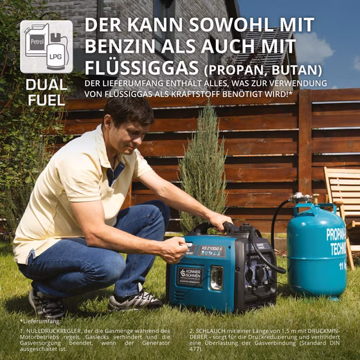 The built-in inverter module with microprocessor control controls the technical processes and generates a stable 230 V / 50 Hz voltage. The generator can be operated with either gasoline or liquid gas (propane, butane). The scope of delivery already includes the gas hose with pressure regulators for connection to a gas bottle according to DIN 477.